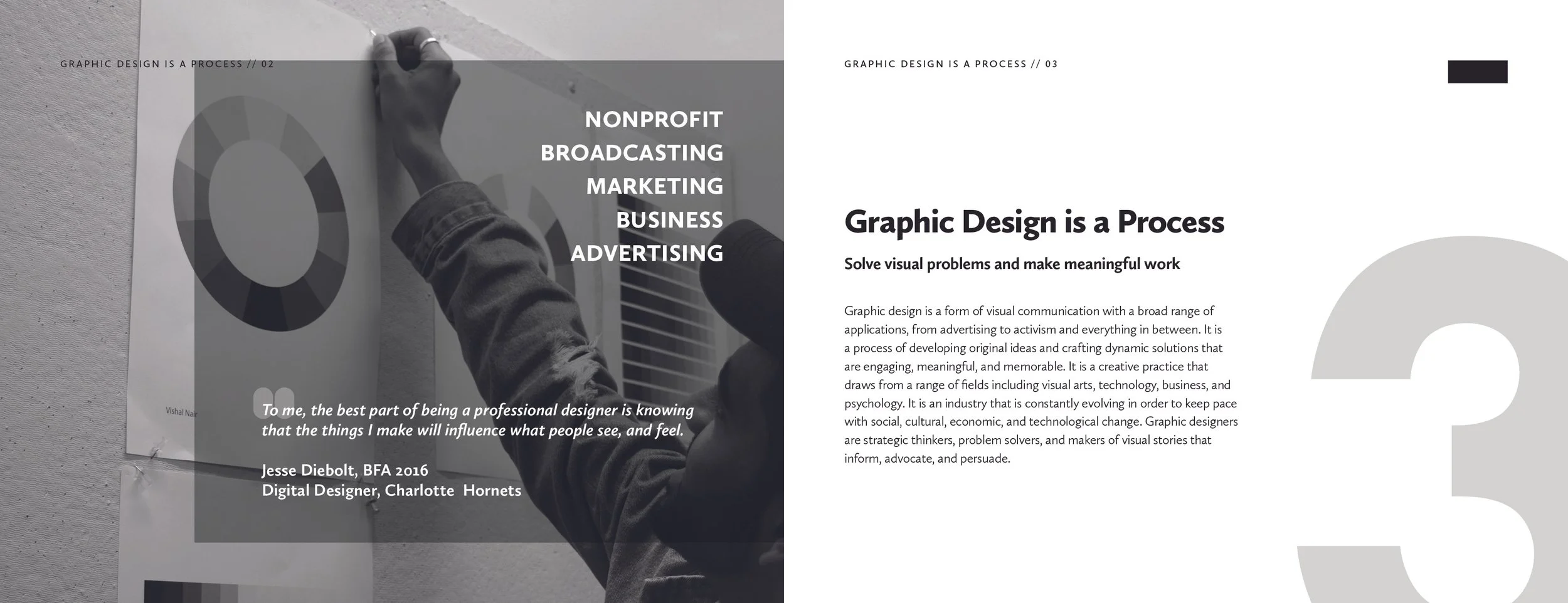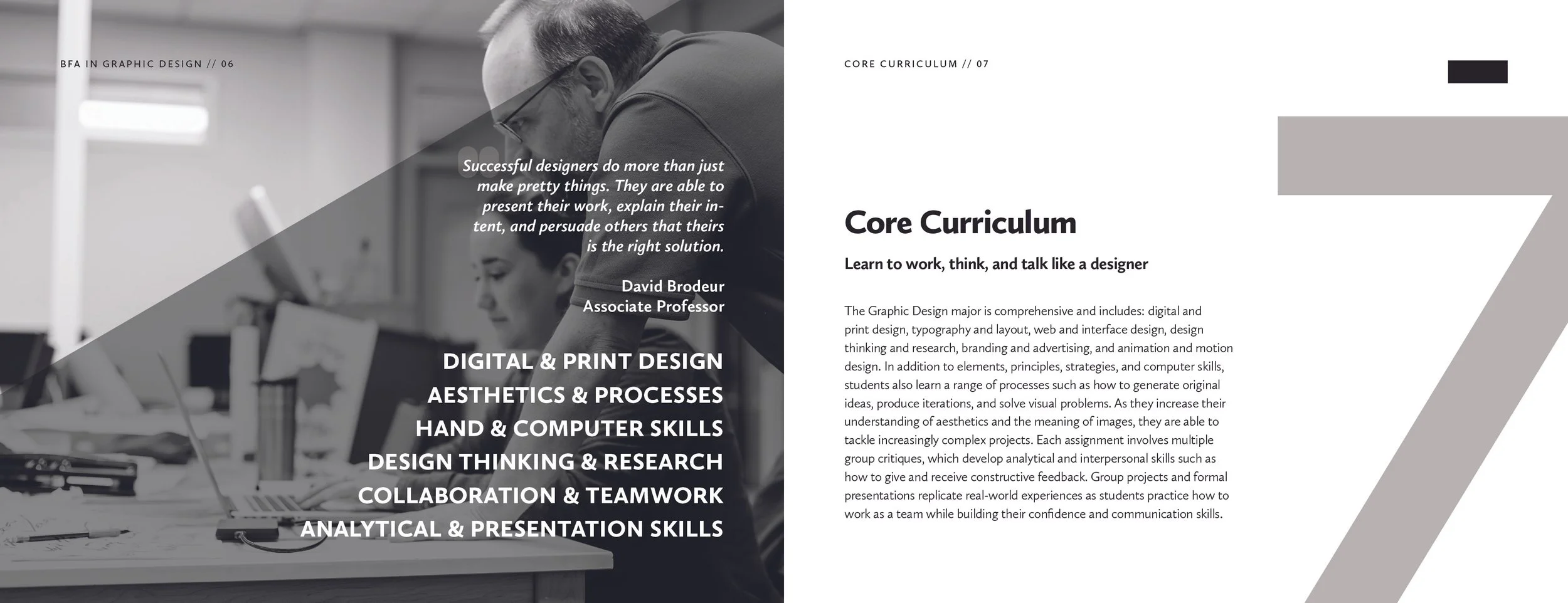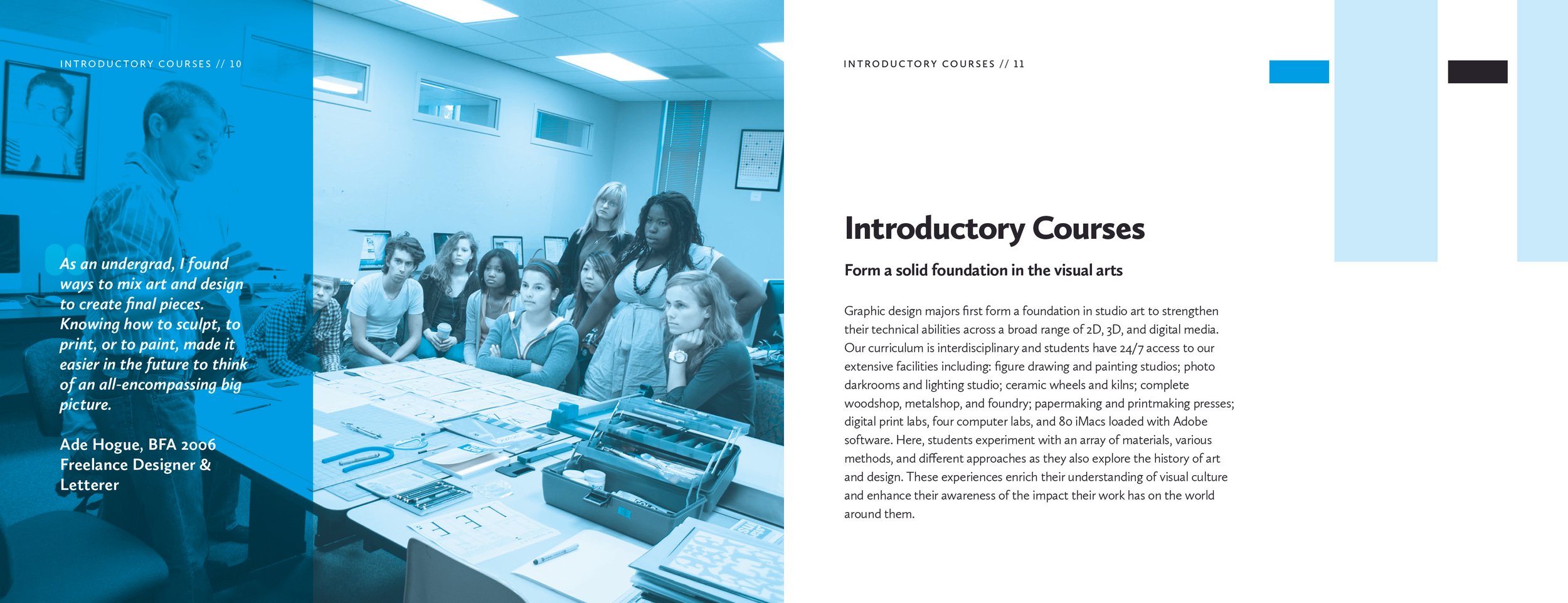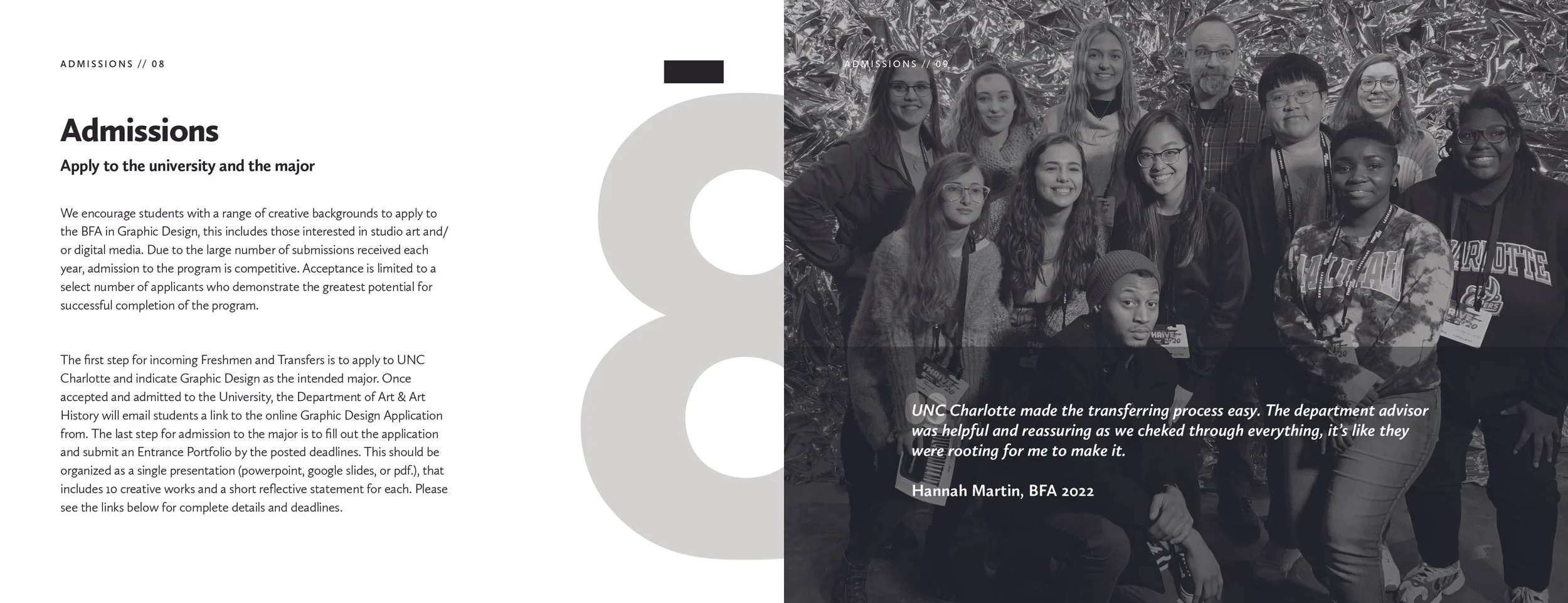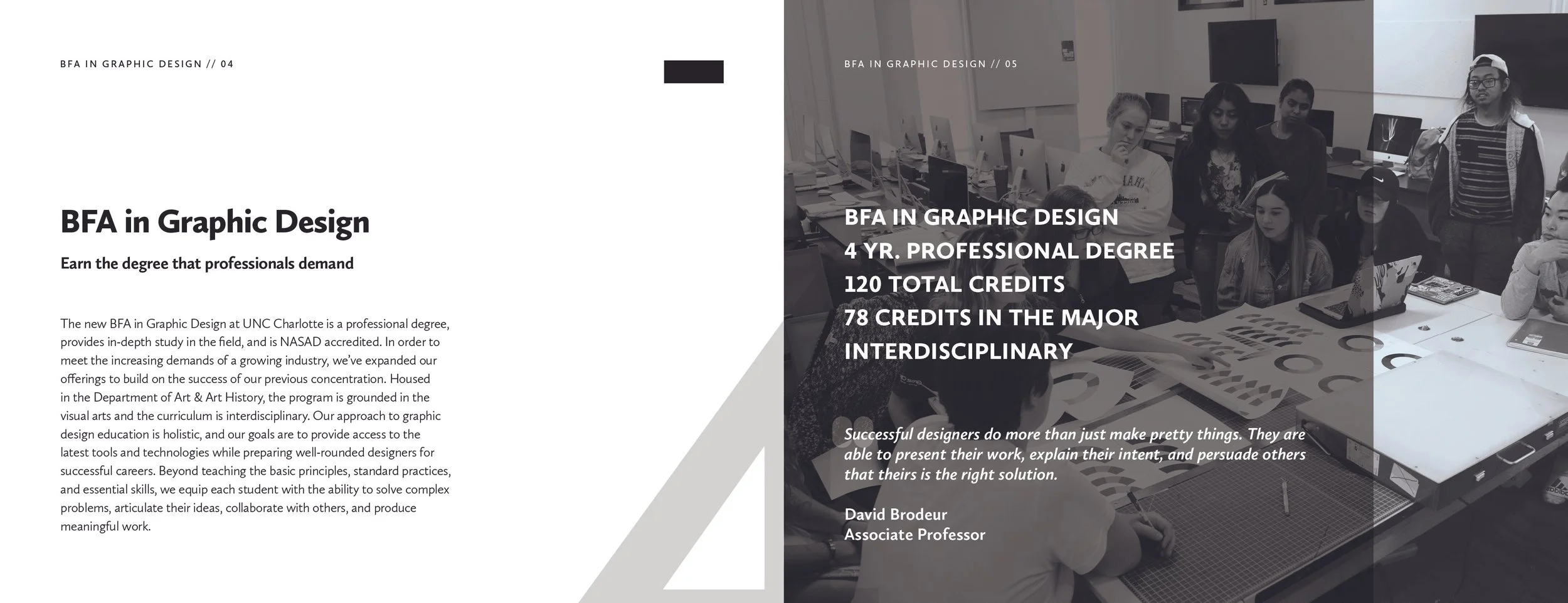 For our images, we wanted to emphasize the process that goes into design. A lot of our images are of students in the process of creating new work. Learning new information is also a part of the design process, which is highlighted in our images of different professors lecturing. Throughout the catalog, these images hint at the opportunities provided to graphic design students at UNC Charlotte. Showcasing these opportunities is not only good for students to see, but also parents and counselors as well. Images provide the reader with a visual representation of the text and overall message, which is why we spent time photographing our own photos and incorporating them in appropriate sections of the catalog.