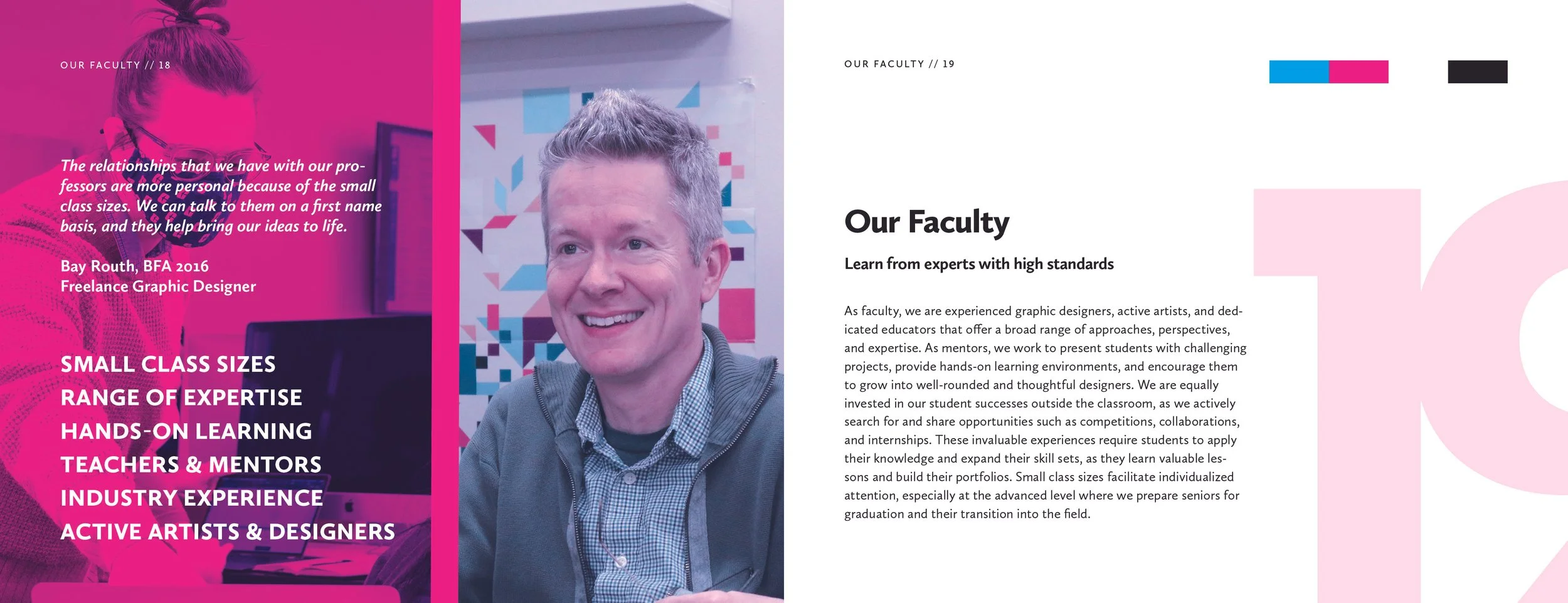 As we’re showing the process of what it’s like to be in the Graphic Design program, we’re also addressing questions of what it’s like to be a student within it. Our concept is personal, realistic, and leaves room for curiosity. We utilized graphic design elements to highlight our concept, which allows readers to navigate through the catalog. Incorporating the colors CMYK throughout the catalog allowed us to categorize each topic, while also highlighting / hiding parts that they can see if they join the program.As the book progresses, a new color is incorporated in the images and layout, until the back cover where the reader is met with a full color image of the University.