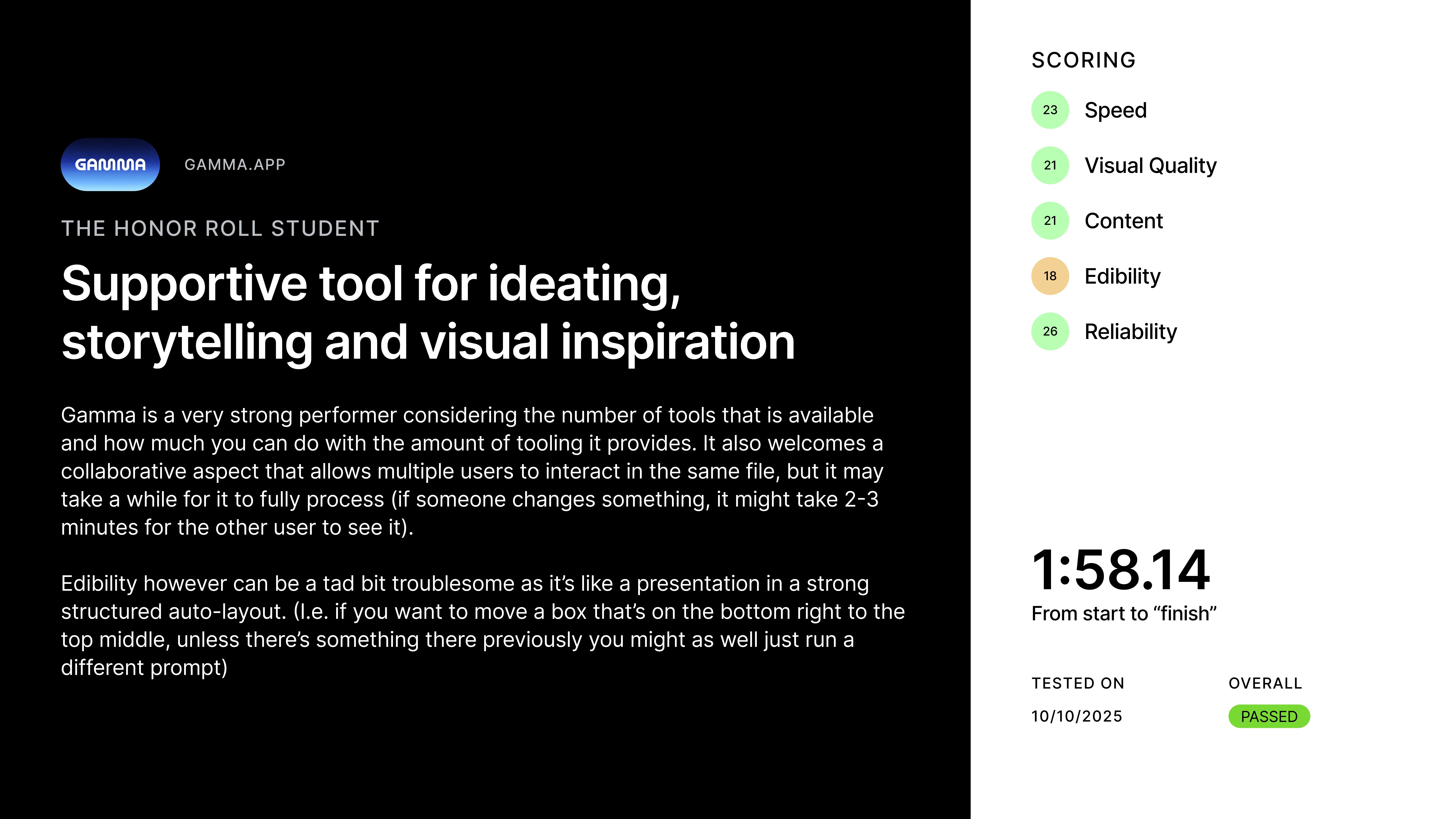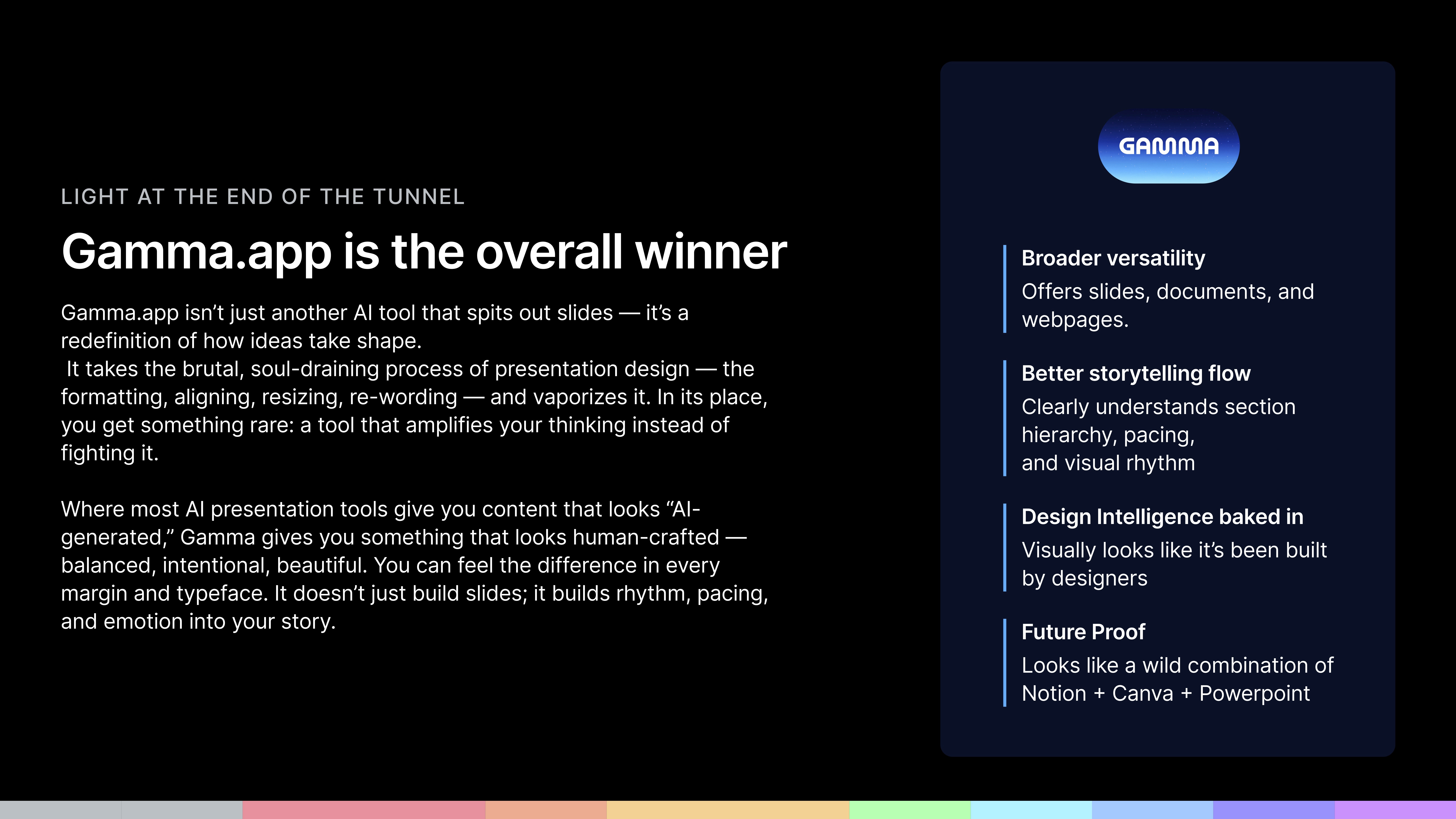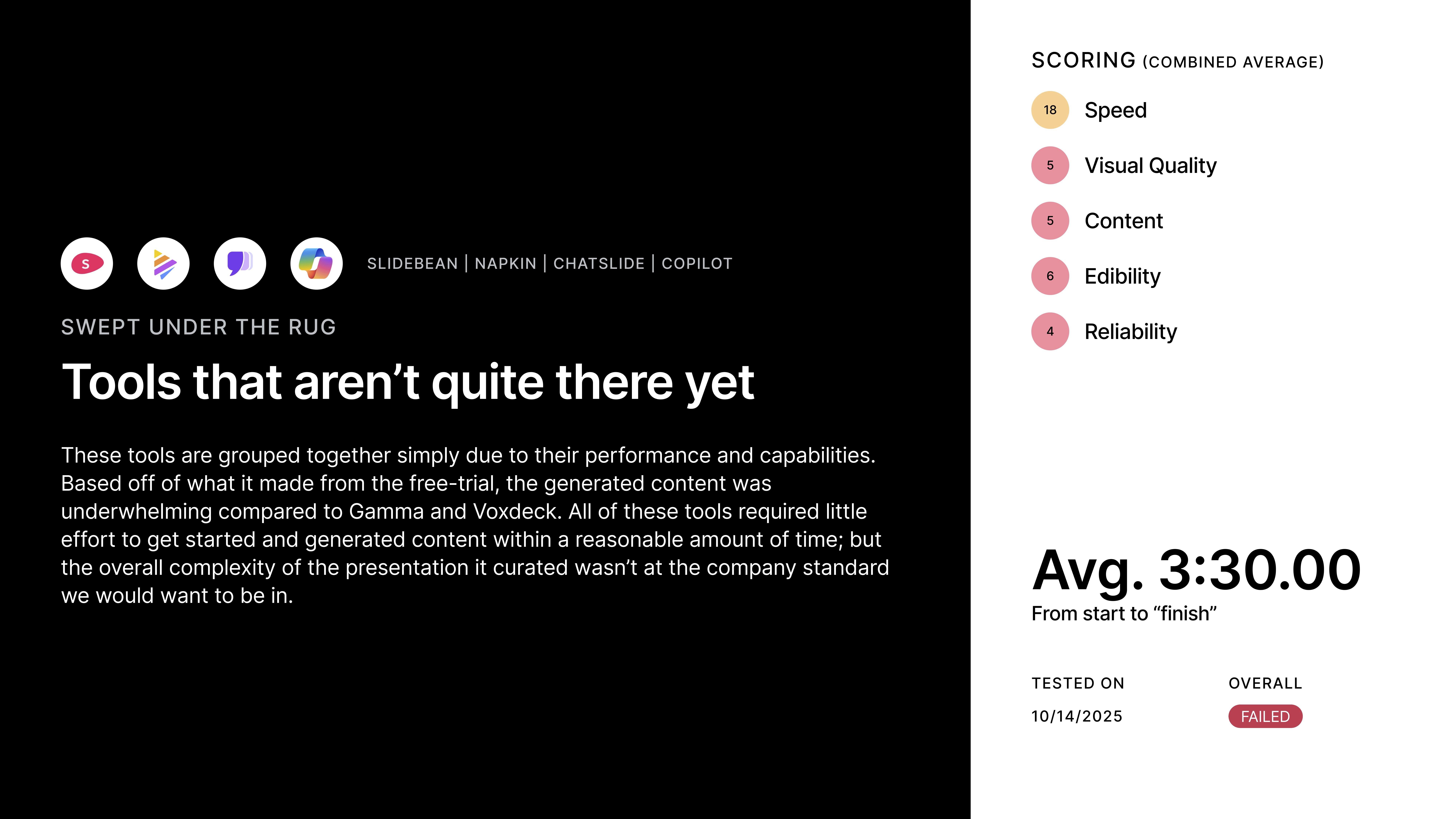 Gamma emerged as the strongest overall performer — fast, visually considered, reliable, and capable of producing content that felt human-crafted rather than generated. Its storytelling structure and design intelligence set it meaningfully apart from the field. Voxdeck showed promise in data visualization and content simplicity but fell short on editability and collaboration. The remaining four tools — Slidebean, Napkin.ai, Chatslide, and Copilot — were grouped together as tools that weren't ready for our standards, each limited in different ways but unified by the same core problem: they optimized for output volume over creative quality.