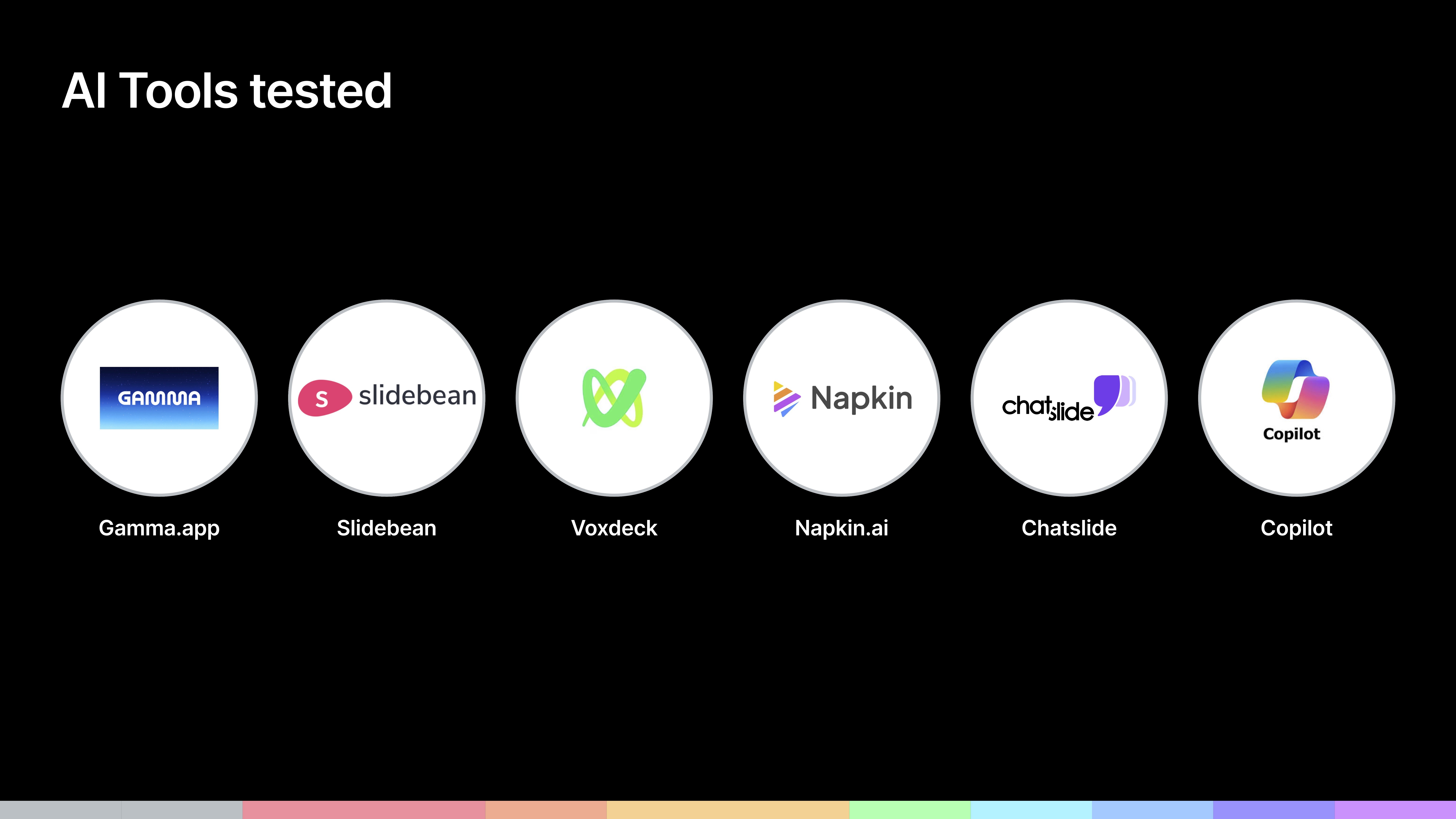Six tools were tested: Gamma, Voxdeck, Slidebean, Napkin.ai, Chatslide, and Microsoft Copilot. Each was given equal time, equal effort, and equal conditions. The goal wasn't to find a winner — it was to find the truth about where AI presentation tooling actually stood relative to our creative standards.
