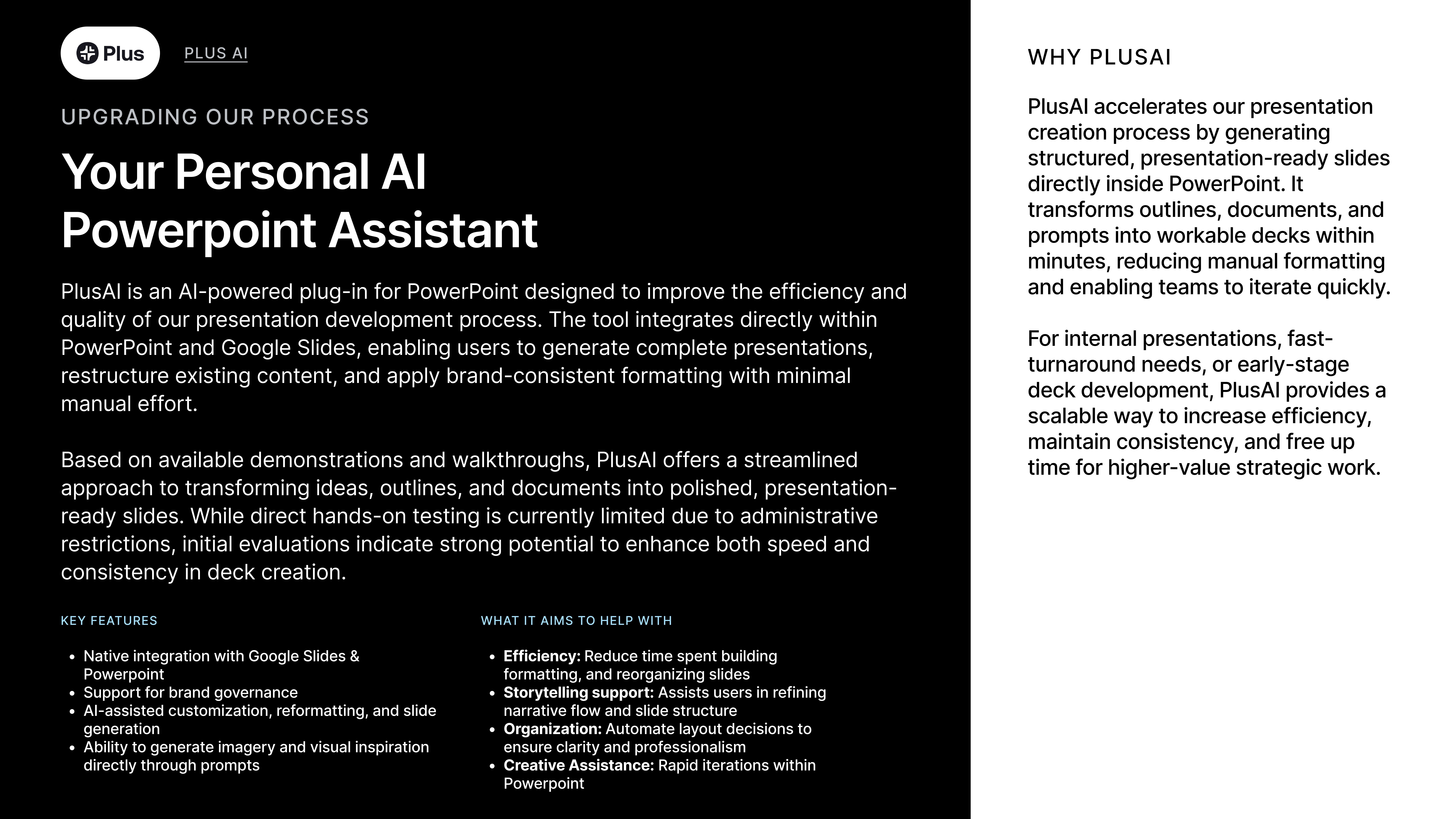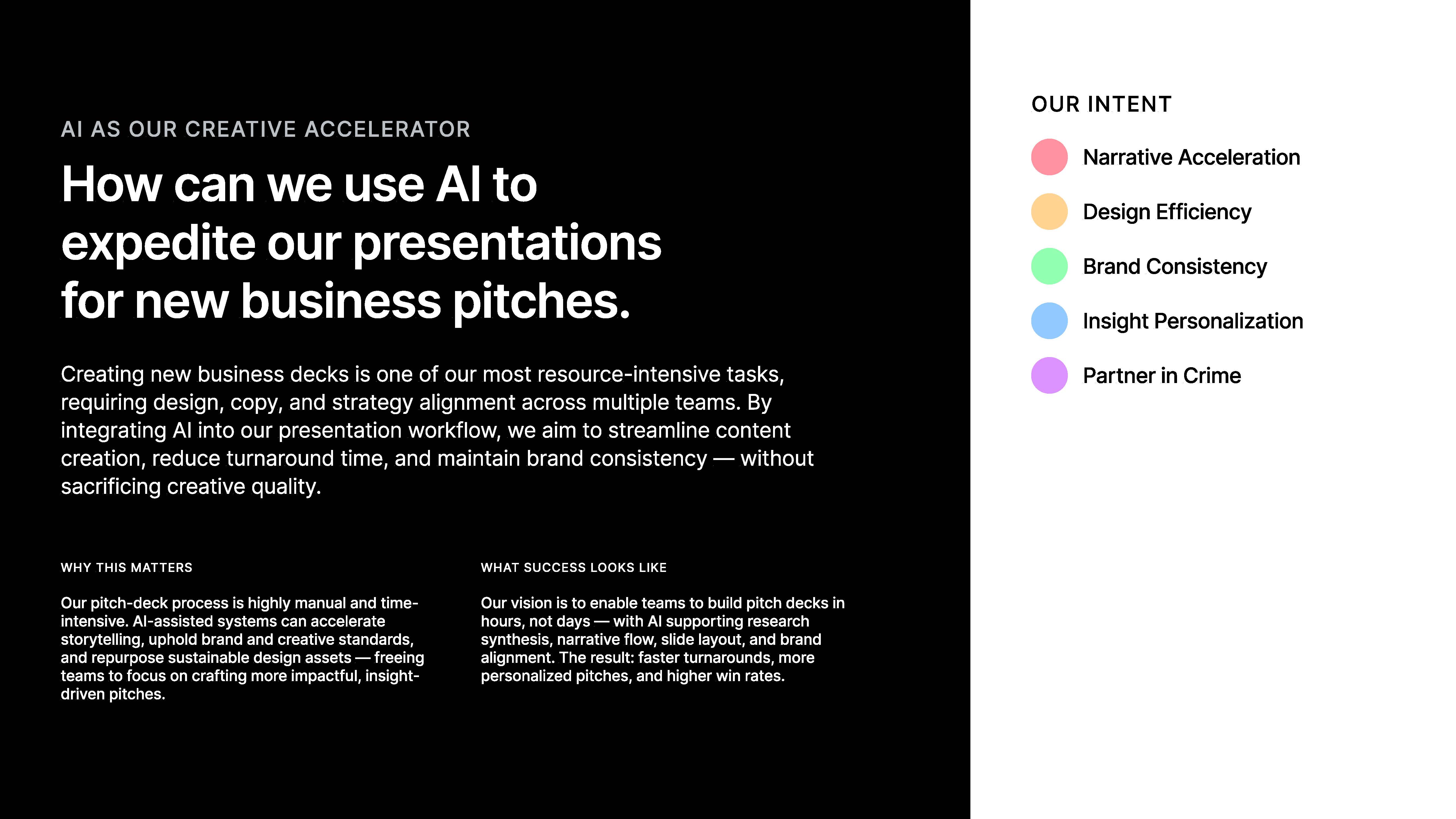 When I transitioned to a new team, a significant portion of my early work involved building partner-facing presentation slides — small, repetitive, and largely mechanical. I was still learning the business, still finding my footing, and spending creative energy on work that felt like it wasn't benefiting anyone. Rather than quietly absorb the frustration, I brought it to my manager and director. The conversation that followed led to a clear question: could AI help us work smarter here?