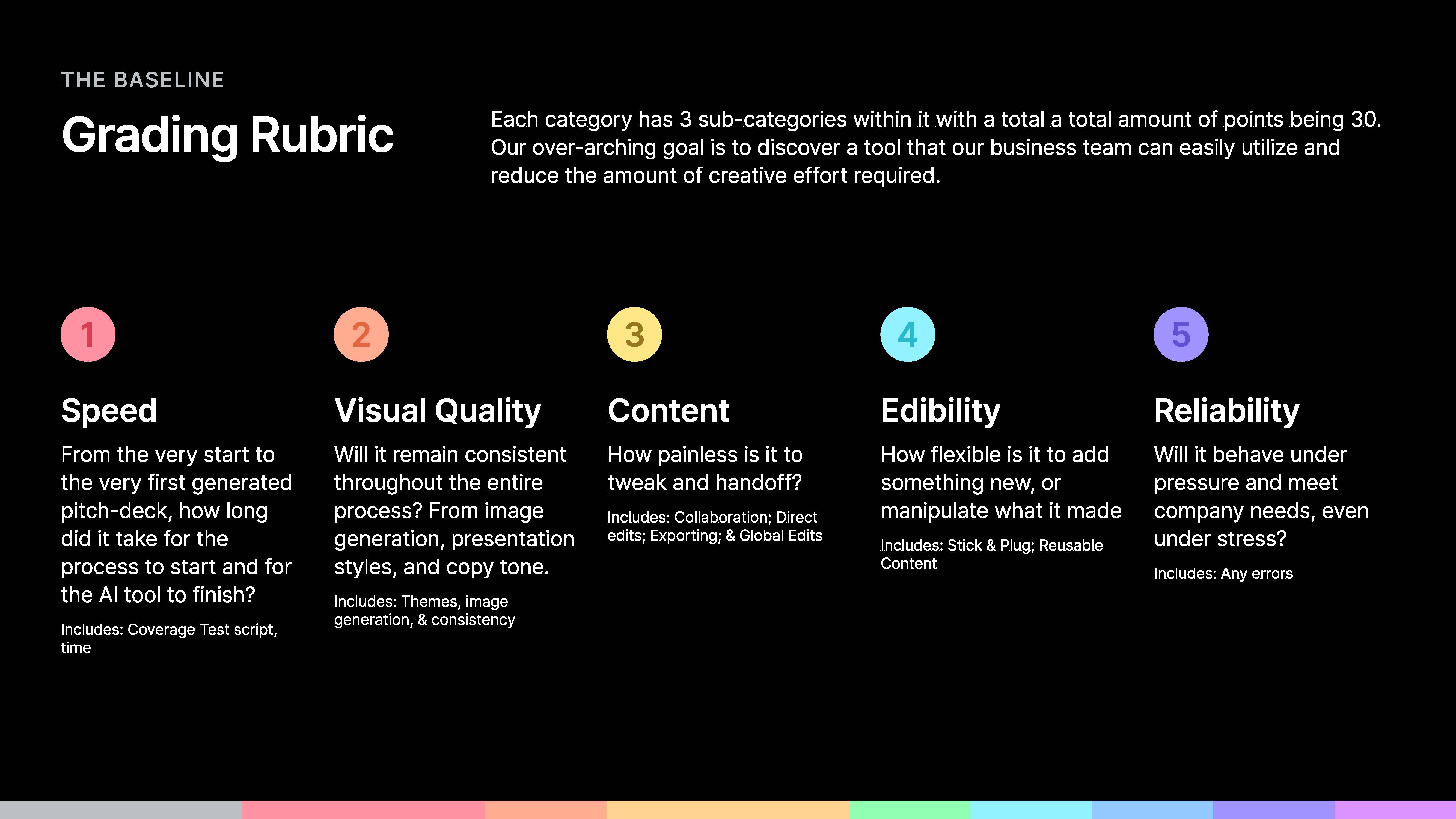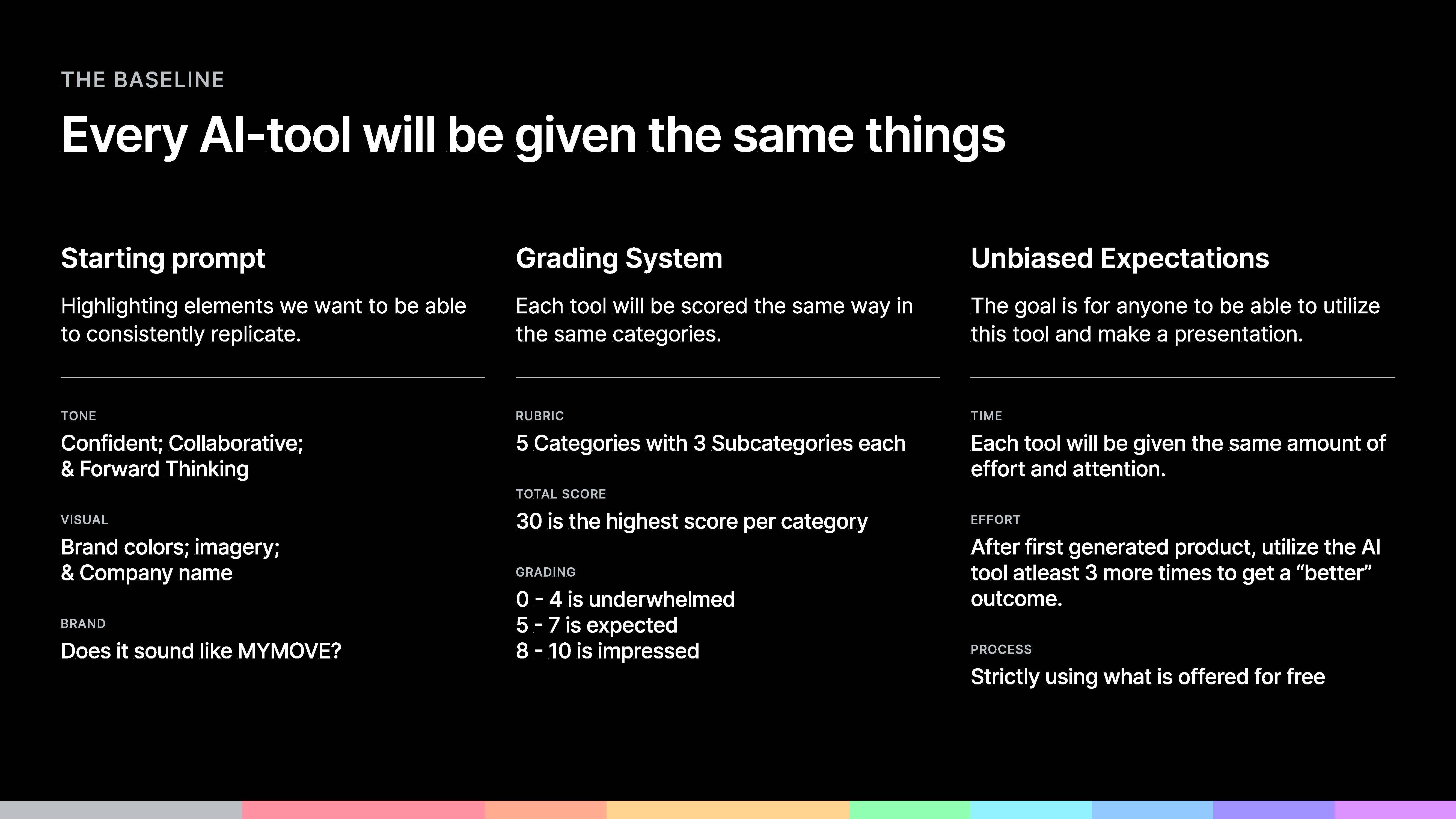 To evaluate AI presentation tools fairly, I built a consistent testing framework before touching a single tool. Every platform received the same prompt — a detailed, brand-specific brief for a MYMOVE × Partner collaboration deck — and was scored across five weighted categories: Speed, Visual Quality, Content, Editability, and Reliability. Each category carried subcriteria with a maximum of 30 points total.