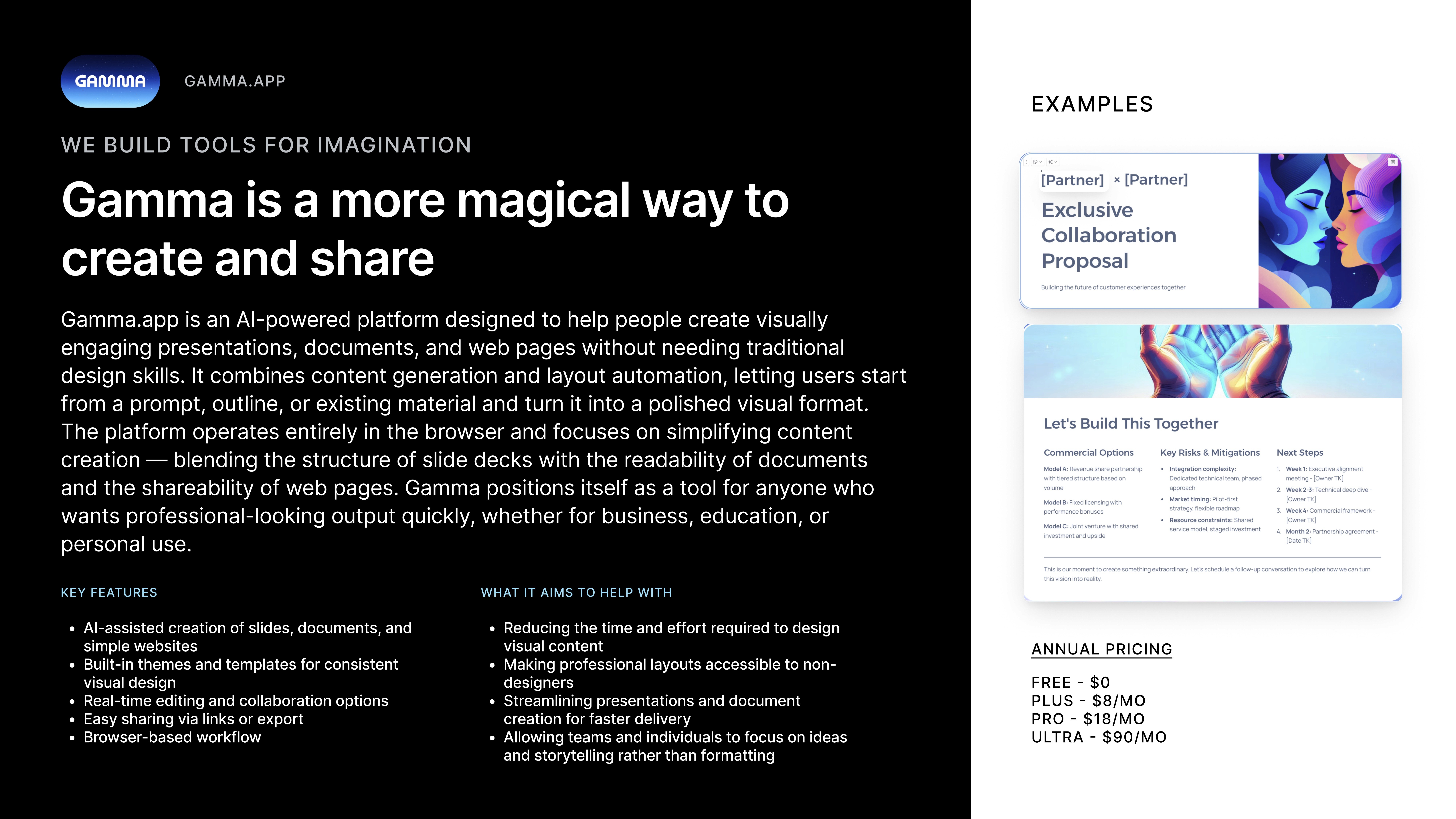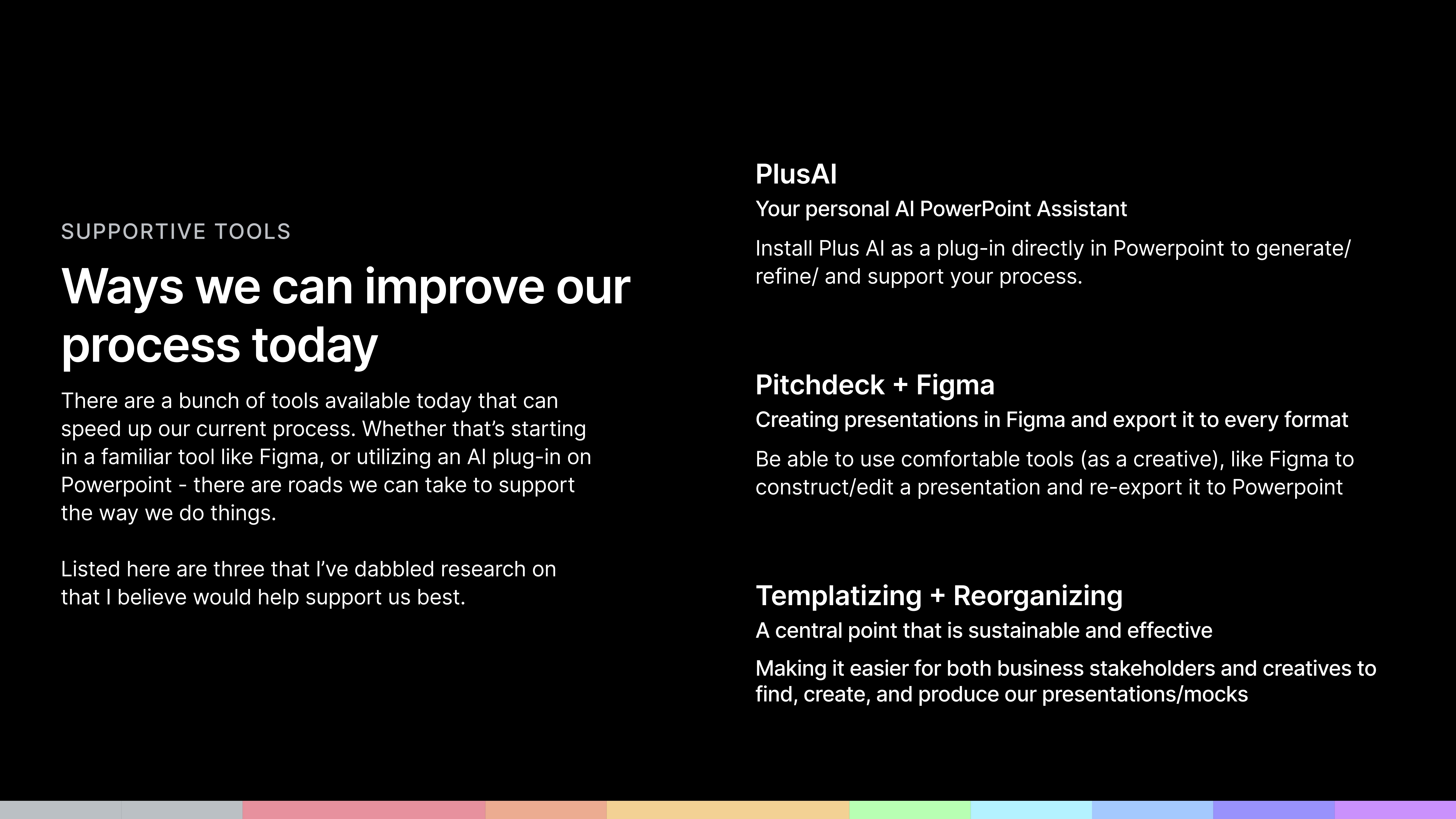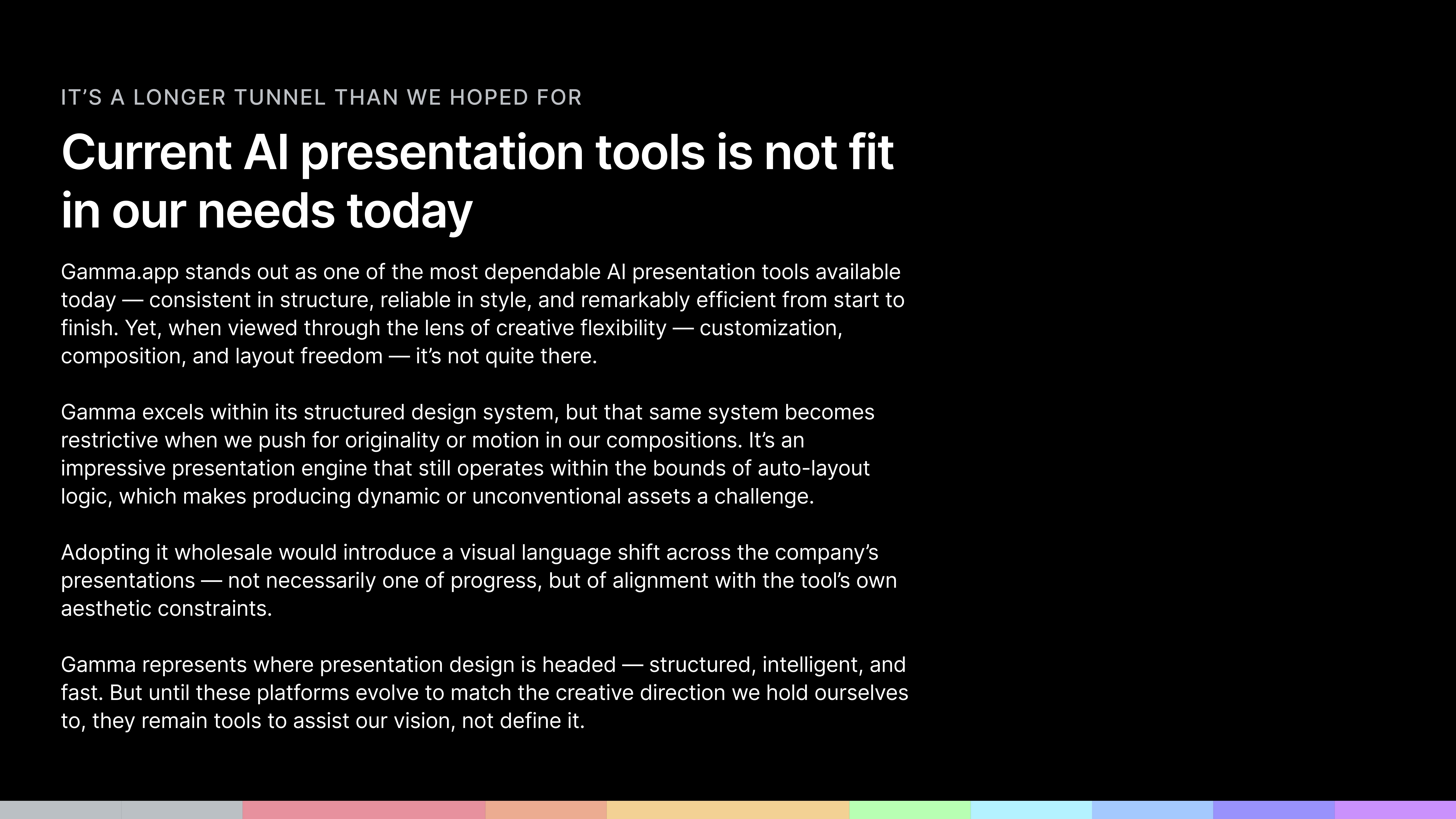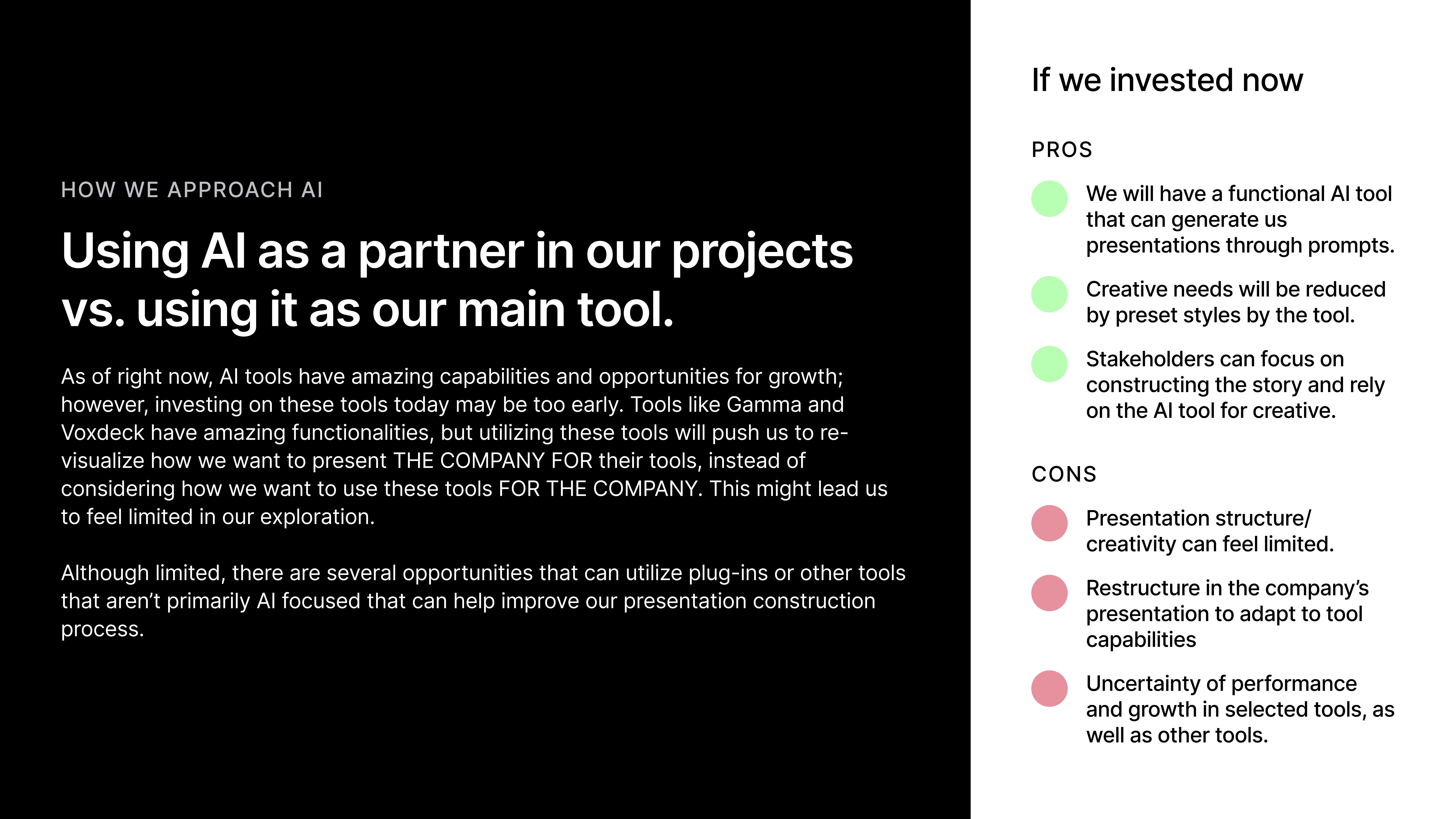 The presentation moved the conversation from individual experimentation to collective strategy. Creative leaders began discussing licensing options and evaluating tools against budget. Gamma was adopted as a resource for ideation and structural inspiration — a starting point that designers could refine rather than a finished product to ship. The workflow became lighter, the philosophy became clearer, and the team had a shared language for how to evaluate AI tools going forward.