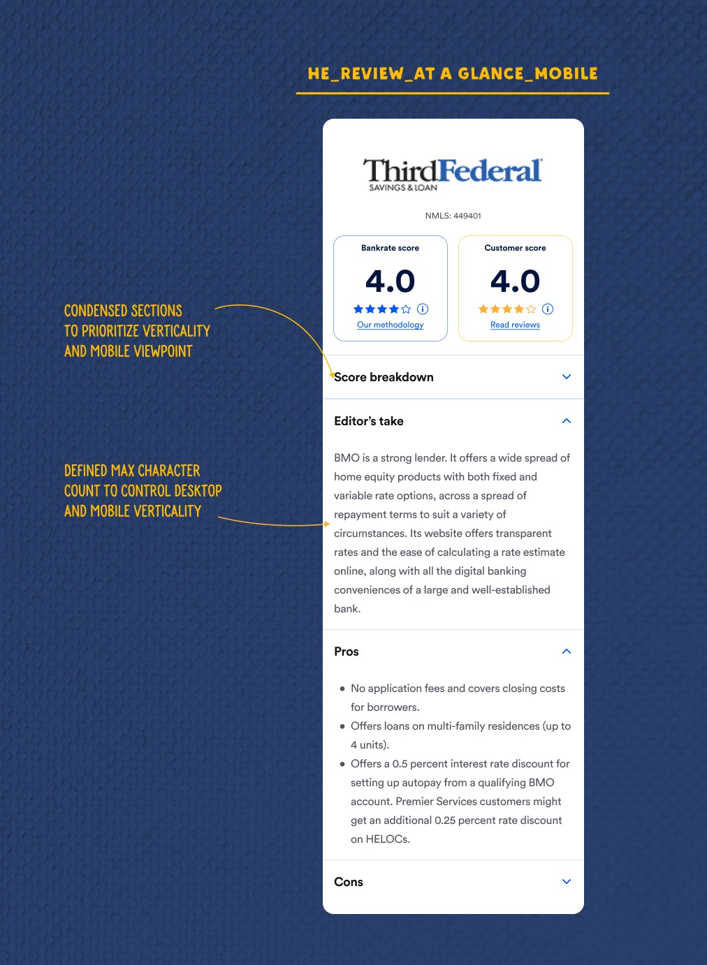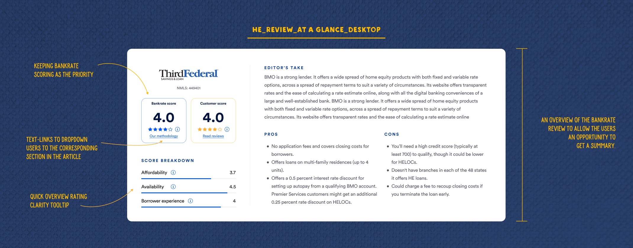The final "At a Glance" design is clean, structured, and intentionally simple. The left side carries all the scoring and value signals — Bankrate score, customer score, score breakdown by category. The right side carries the editorial summary — Editor's Take, pros, cons. Two clear zones. Eye movement traces naturally from quantitative judgment to qualitative context without cognitive friction.
